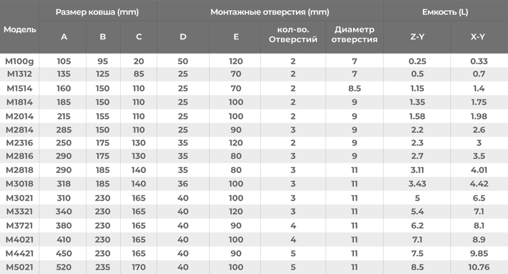 - Минимальное расстояние между ковшами: глубина ковша «C» + 5 мм.