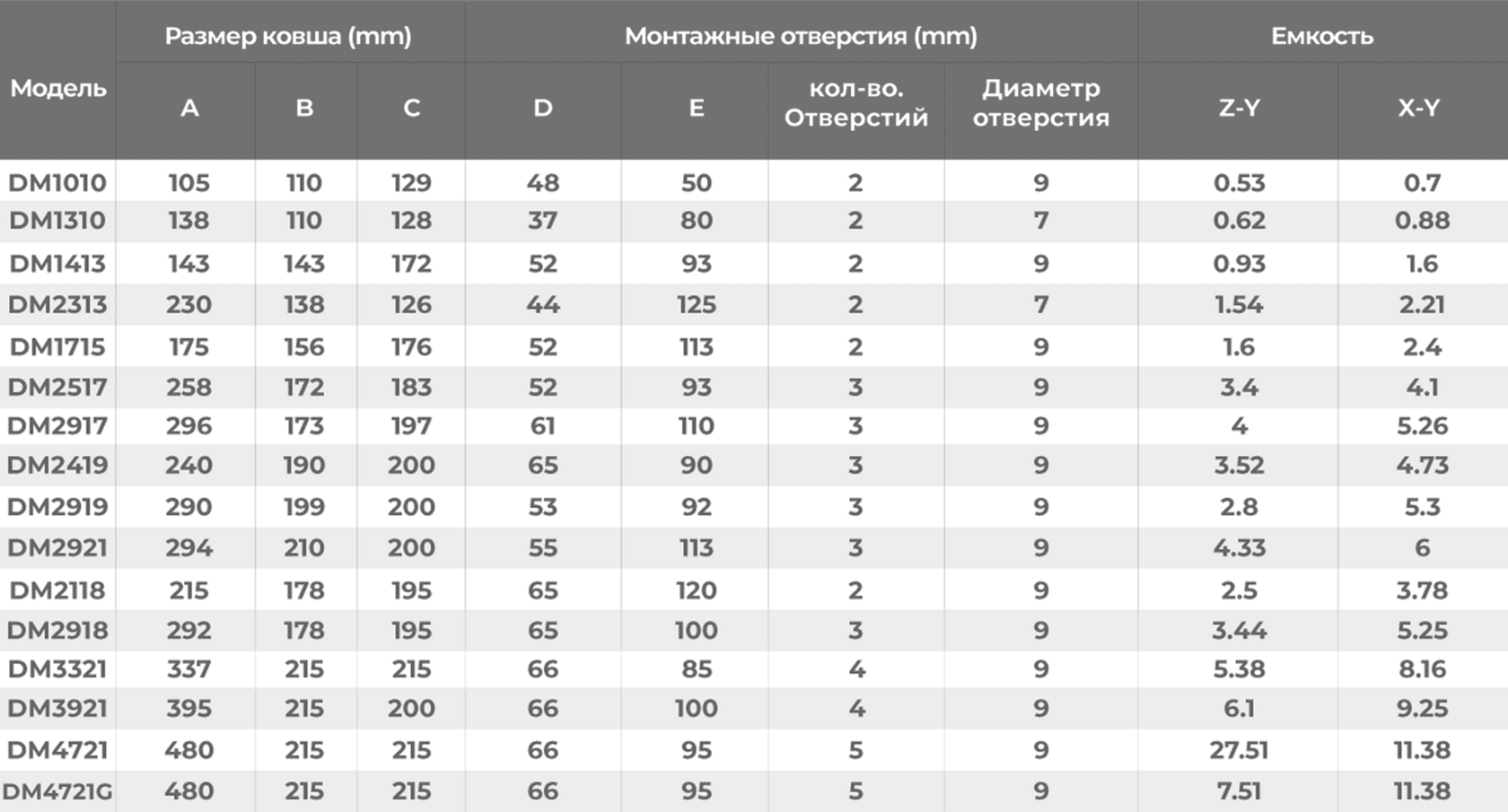 Минимальное расстояние между ковшами: глубина ковша «C» + 2 мм.